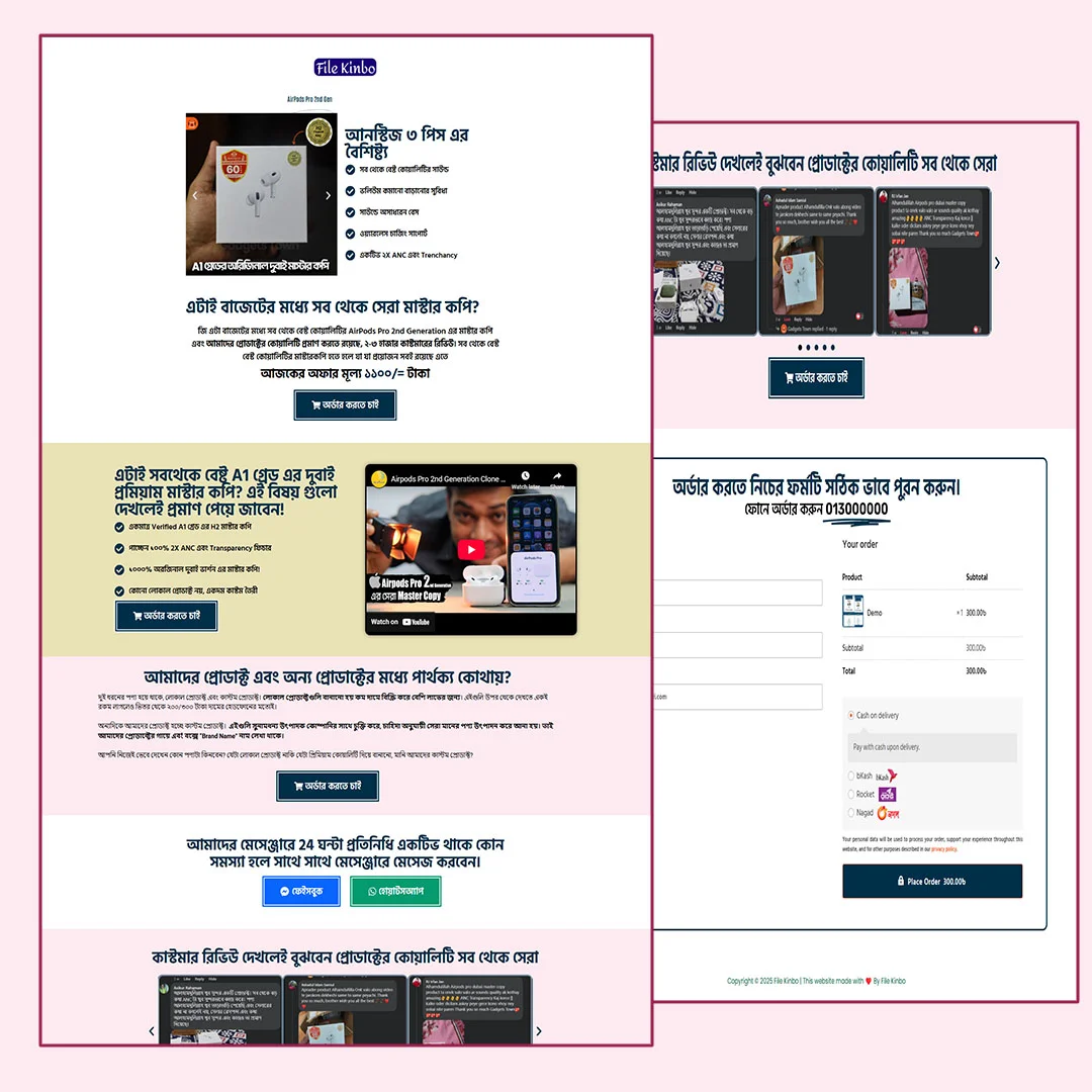 আপনি কি চান AirPods Pro প্রোডাক্টের জন্য প্রফেশনাল, সেলস-ফ্রেন্ডলি এবং কনভার্সন-বুস্টিং ল্যান্ডিং পেজ? এই ল্যান্ডিং পেজগুলি ডিজাইন করা হয়েছে রেসপন্সিভ, SEO-ফ্রেন্ডলি এবং ইউজার-ফ্রেন্ডলি করে, যাতে আপনার ভিজিটররা সহজে কিনতে পারে এবং বিক্রয় বাড়ে।