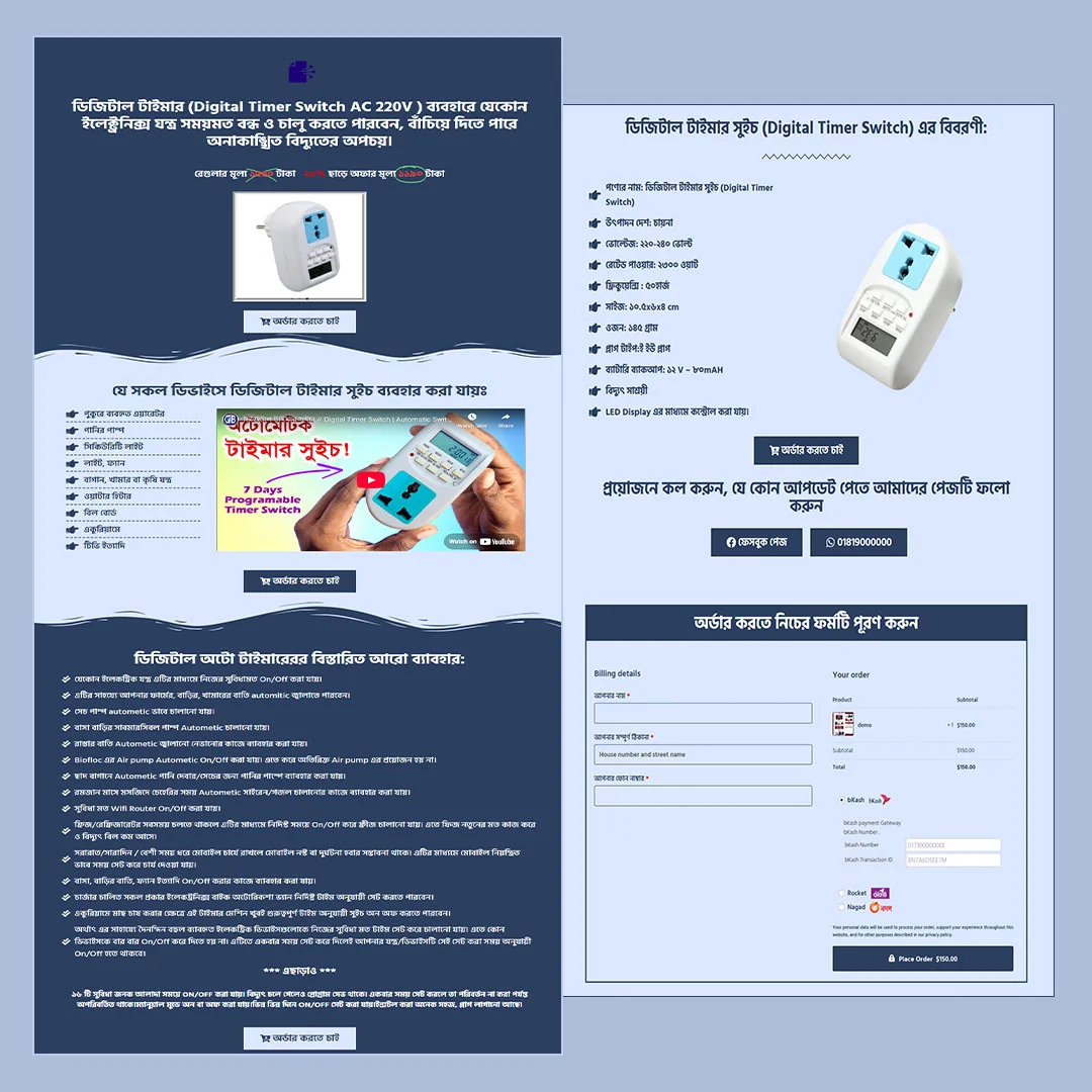 আপনি কি চান আপনার Digital Timer Switch প্রোডাক্টের জন্য প্রফেশনাল এবং কনভার্সন-বুস্টিং ল্যান্ডিং পেজ? এই Cartflows ল্যান্ডিং পেজ ডিজাইন করা হয়েছে এমনভাবে যাতে ভিজিটররা সহজেই প্রোডাক্ট এক্সপ্লোর, রিভিউ দেখতে এবং কিনতে পারে। এটি আপনার বিক্রয় বাড়াতে এবং ব্র্যান্ডকে প্রফেশনালভাবে উপস্থাপন করতে সাহায্য করবে।